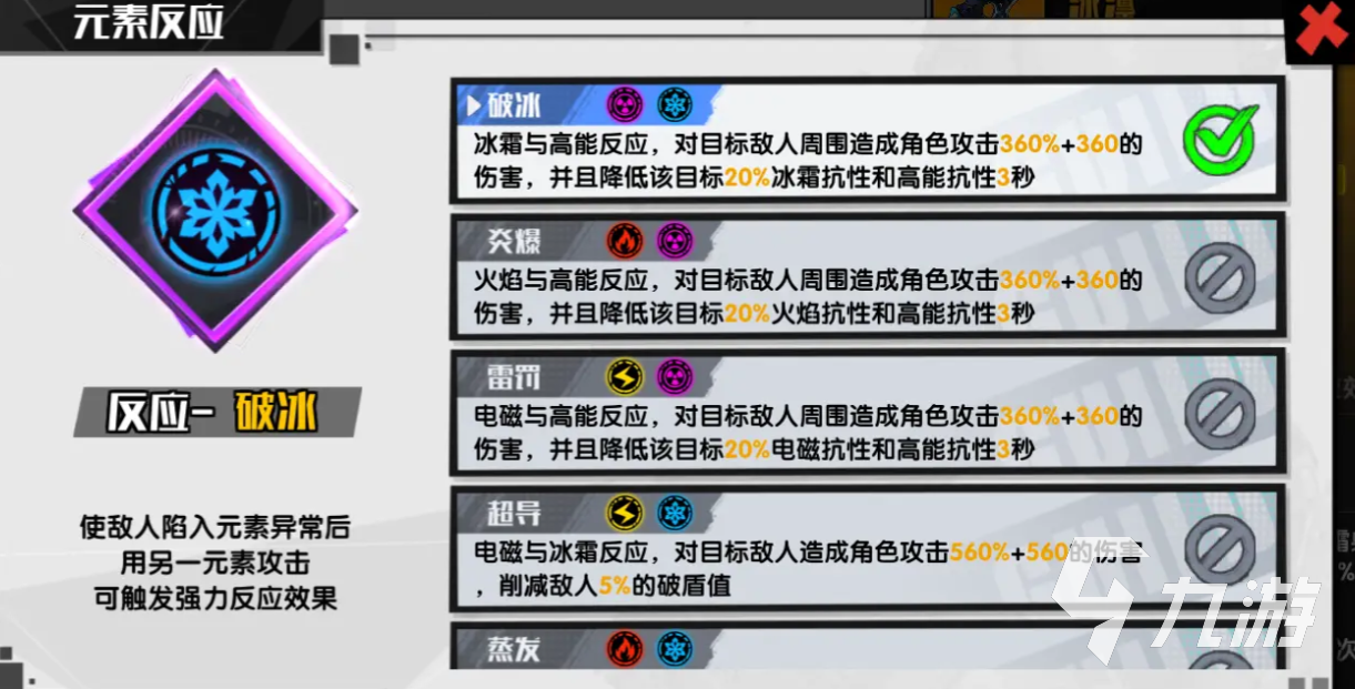 第10属性伤害,会有电、火、冰和高能,会根据角色的不同而变化,11是元素反应伤害,我们在对怪物进行攻击后,用不同元素造成的伤害都会完成反应,实现对应的伤害效果,具体可看下图,12伤害百分比增幅,这个可以和最终伤害相互叠加。