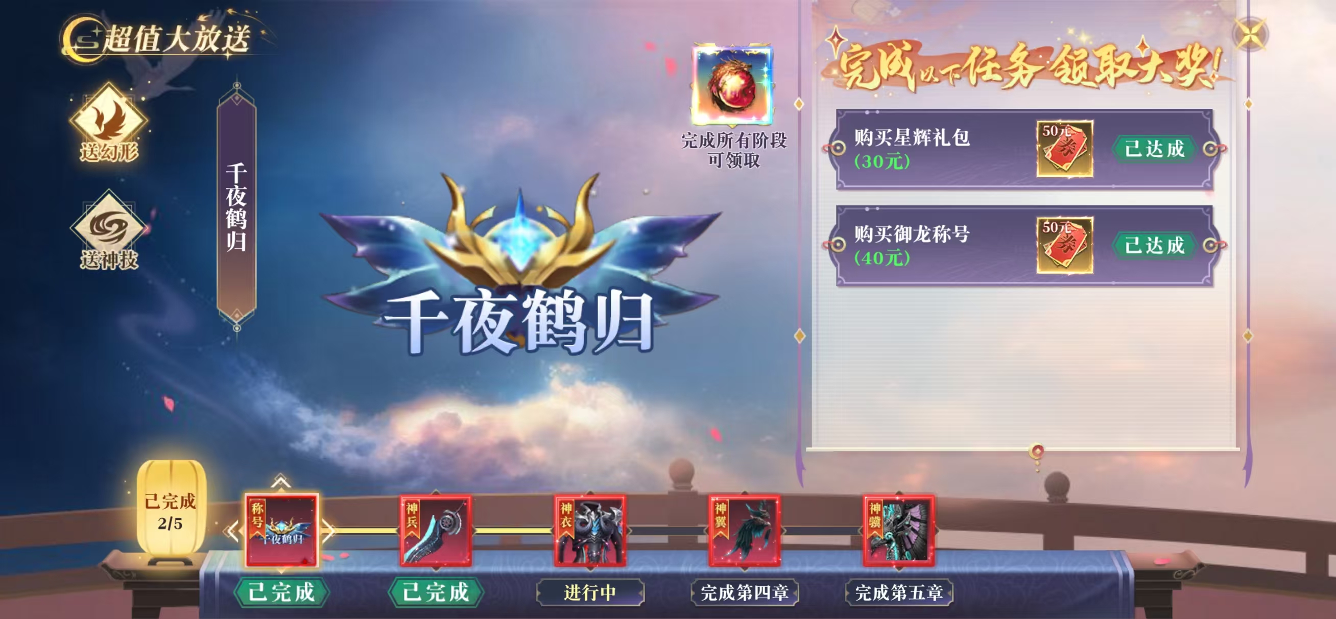 新手核心储值,付费玩家必参与活动,购买封神卡后显示,每日登录可以铜钱,完成章节任务解锁神话装备(称号、武器、神衣、翅膀等),更有【珍品龙血丹】解锁,每次使用可提升太古龙力(战力、生命、攻击、防御)