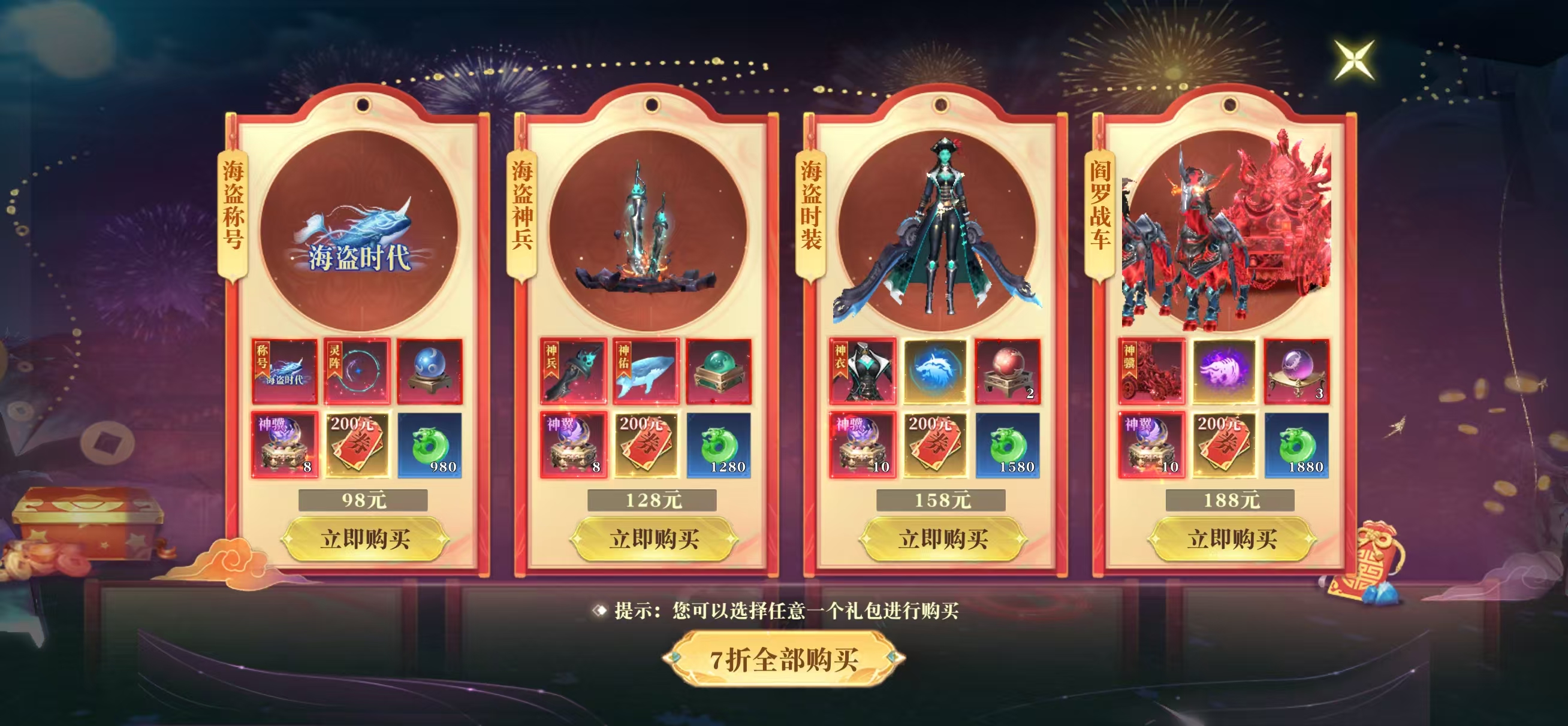 3倍充值宝券返还,双倍灵玉返还,小额充值必备礼包,一键打包可享5折优惠。
