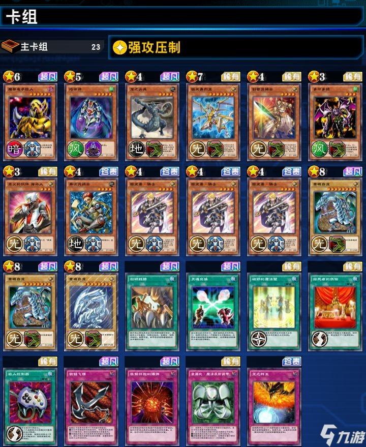 怪物卡主要由暗黑烈焰龙、青眼白龙、弧光勇烈龙、创世龙骑士、巨龙圣骑士和龙之骑士组成,要是能多凑张融合卡就更完美了,这样召唤龙破坏剑士之后爆发力会得到进一步提高,也可以根据喜好把海马人加进去。
