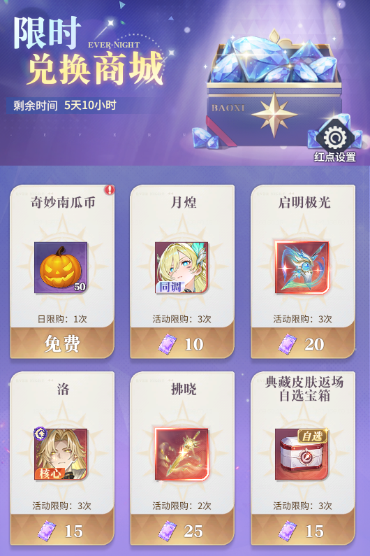 守护者-月煌、守护者-洛、月煌专武-启明极光、典藏皮肤返场自选宝箱等。