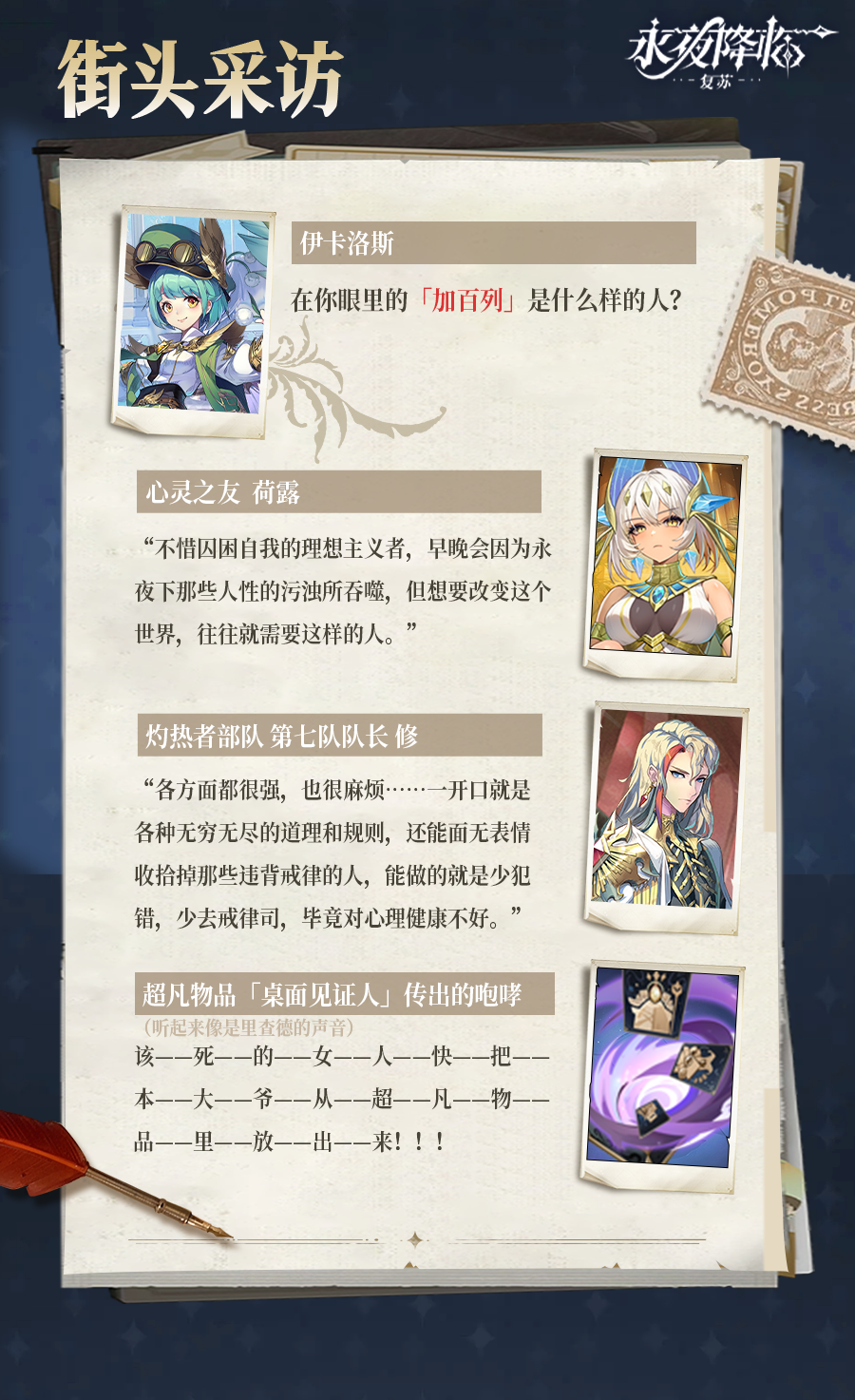 经过那段往事后,加百列发誓要忠诚于戒律,成为了戒律司的“天选打工人”。至于作为下属的灼热者们是什么体验?别急,伊卡洛斯的报道马上就来,据说内容相当精彩……(吃瓜.jpg)