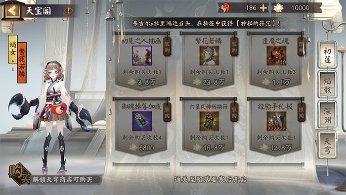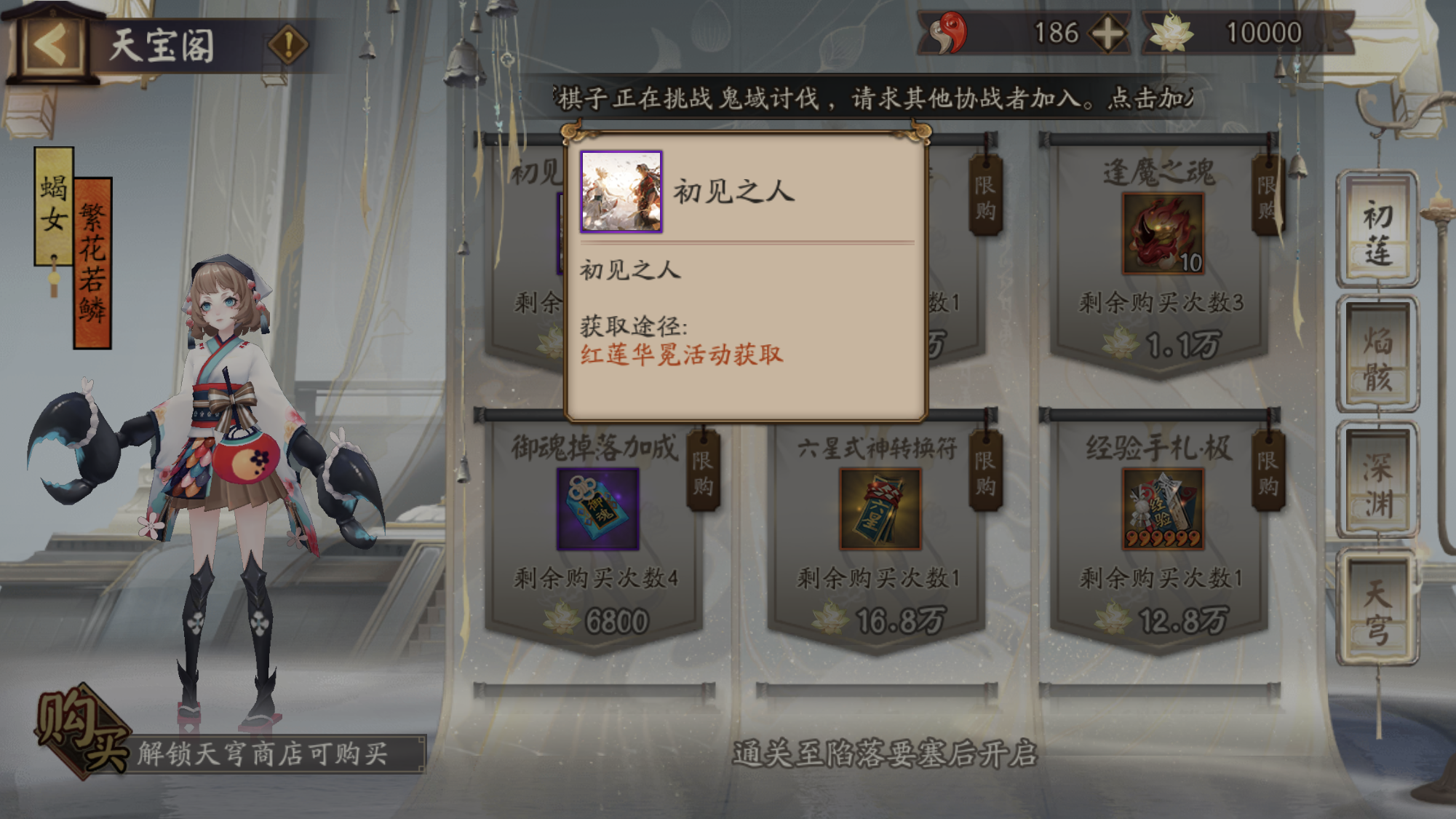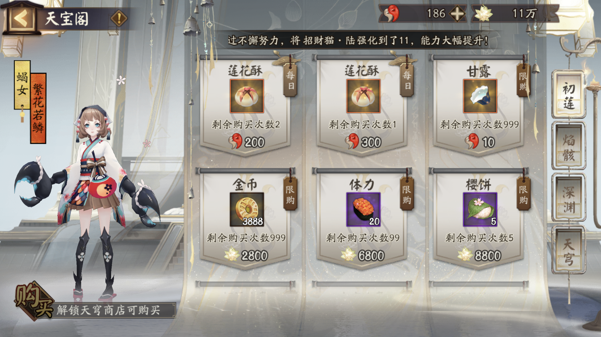 天宝阁分为初莲、焰骸、深渊、天穹四个等级,初莲是不设门槛可以直接进行购买的。出售的物品有莲花酥、甘露、金币、体力、樱饼。莲花酥是进行鬼域讨伐副本任务所需的道具,在初莲阶段商店可以使用勾玉来购买,一共限购三个。甘露是可以用来复活帝释天的道具。莲花酥和甘露都是需要用勾玉进行购买的,需求也是出于副本讨伐中的需求。其他的初莲阶段物品不建议进行购买。