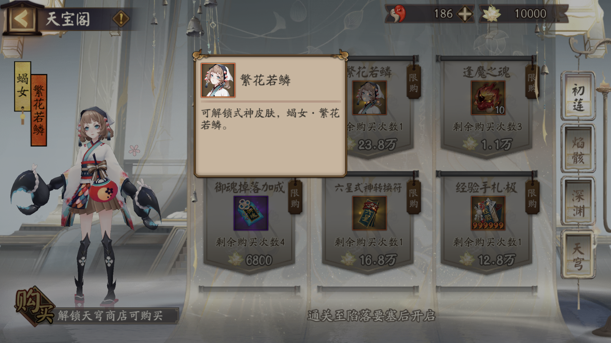 天穹阶段商店在通关善见城门、善见边境、鬼域平原、鬼域腹地、陷落要塞后才能开启购买。价格最高的就是蝎女的繁花若鳞皮肤,这个的购买就看个人喜好了。其次商店的经验手札·极和六星式神转换符要培养新式神是绝不能错过的,这两件物品都是限购一张。新式神若要搭配新御魂逢魔之魂也是必需品,可以兑换30个。
