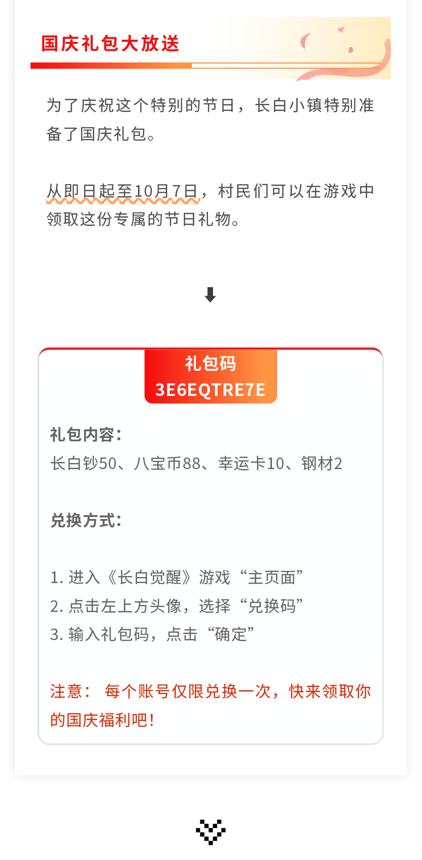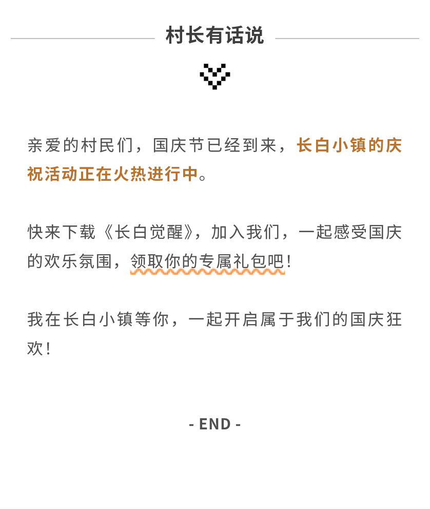 手机游戏> 长白觉醒> 游戏新闻> 国庆狂欢:小镇上的惊喜瞬间!(内含礼包码)