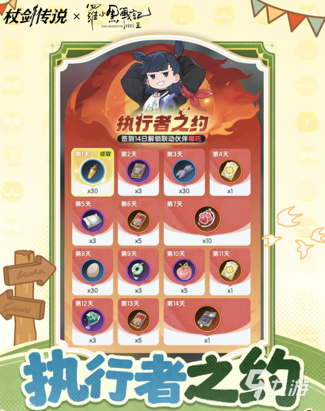 然后是福利活动,在活动期间只要参与签到就能直接领取道具奖励,签到14天还可以直接免费获得哪吒,觉得一位伙伴不够的还可以去完成任务,领取转盘券,利用转盘券到喵喵转盘抽奖,可以保底获得至少1位伙伴。