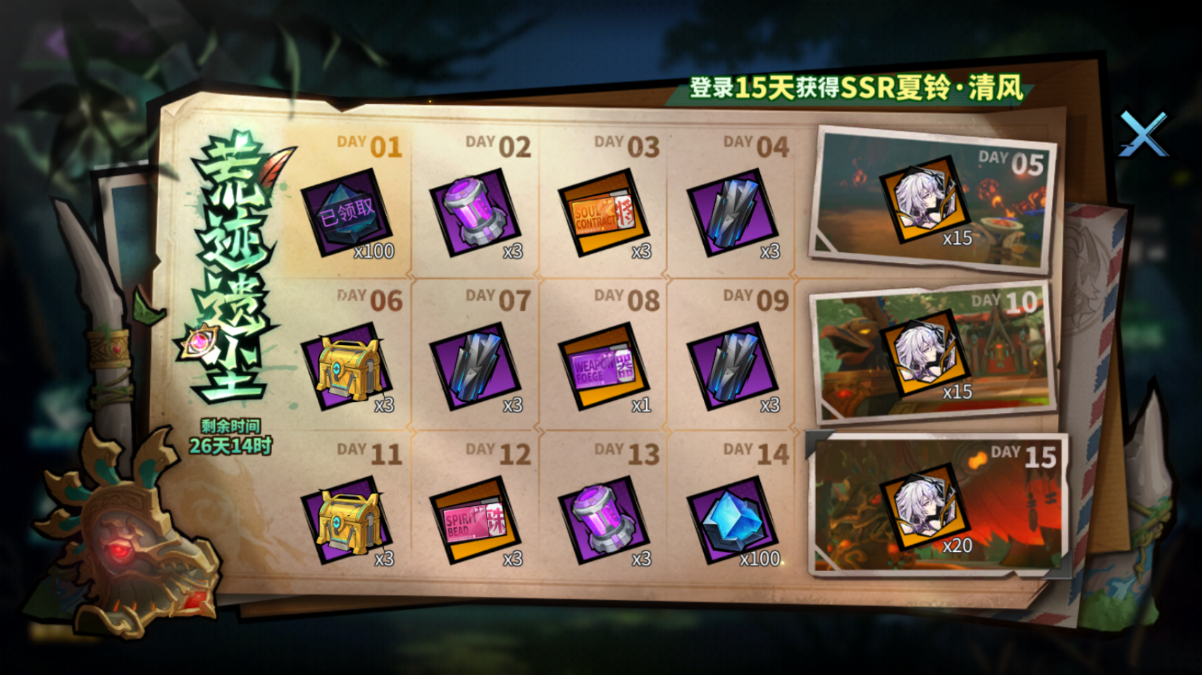 活动期间,每日签到即可领取奖励,奖励中包含「灵将契约券」「武器锻造券」「魂晶」等道具,还可合计获得「灵魂碎片·清风」*50!