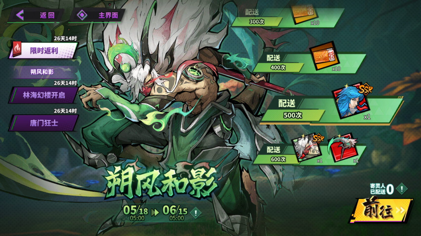 活动期间,完成寄灵人配送达到指定次数,即可领取相应的奖励。奖励包含大量「灵将契约券」,最高可获得当期活动UP池概率提升SSR寄灵人和专属红品武器奖励。