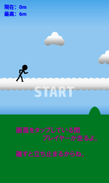 ◆◇◇◆◇◇◆◇◇◆◇◇◆ [ ルール・操作 ] ・画面をタップしている間プレイヤーが走るよ。 ・上から邪魔する丸太のオバケをかわして走ろう。 ・少しでも邪魔する丸太のオバケに触れるとゲームオーバーだよ。 [ スコアについて ] 一定距離進むごとに1mが追加されます。 何m進めるか?が、勝負だよ。 ◆◇◇◆◇◇◆◇◇◆◇◇◆ [ 注意 ] このゲームは、日曜大工気分&趣味で製作しております。 従って・・・ ゲームの画像や、内容等・質の悪さを予め、ご了承ください(笑) [ ストーリー ] 主人公のクロボウ君の住む村の言い伝えによれば・・・ 大空の彼方向こうに、幸せの国があるらしい・・・ それを知ったクロボウ君は、いつか その「幸せの国」へ 行ってみたいと思うようになりました。 ある日、暇で、暇で仕方が無いので、暇つぶしを兼ねて 散歩へ出かけました。 すると・・・ そこには、どこまでも、どもまでも空高く続くハシゴがありました。 それを見て、クロボウ君は思いました。 「これを登れば、いつか聞いた幸せの国へ行けるかも知れないっ!w」 そう考えたクロボウ君は必死でハシゴを登り、途中から電柱になり・・・ 空高く上ると、今度は幸せの国へ続く雲の道に辿り着いたのでしたw 今度のクロボウ君は幸せの国を目指して雲の道を駆け抜ける!! と、言う物語です・・・ いや、ゲームです。w そんな訳で、幸せの国を目指して雲の道を駆け抜けてちょぉ~だいっw [ ゲームのポイント説明 ] 1.画面の何処をタップしてもOK。 プレイヤーが走り出します。 2.障害物(丸太のオバケ)には、ほんの少し触れただけで ゲームオーバーになります。 3.制限時間はありません。コツを掴んで、どこまでも駆け抜けて下さい。 ここまで、読んで下さった方へ 「心からお礼申し上げます。 ありがとうございます。」 ------------------------------------------------------------------ BGMなどでお世話になっているサイト ・魔王魂