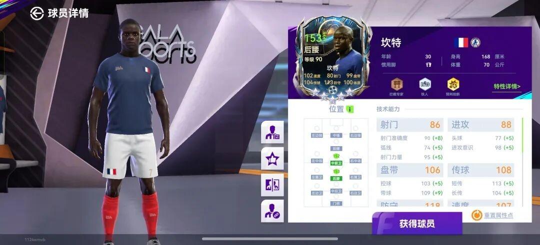 我使用的核心球员是经典时刻坎特。经典时刻坎特不但数据十分出色,还拥有后腰的关键技能【预判抢断】,除此之外,【铁人】特性还极大地增强了他的续航能力。