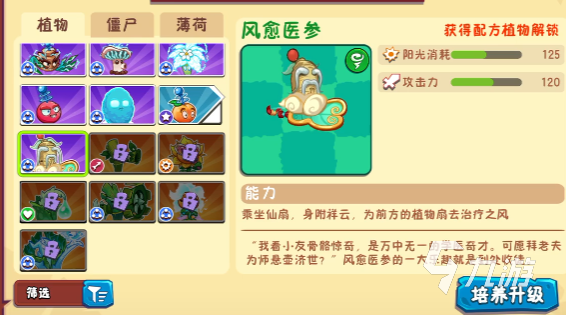 风愈医参可以为前方的植物带来一股治疗之风,有它在前排的植物将能持续回血,帮助抵御伤害保护后方的队友。