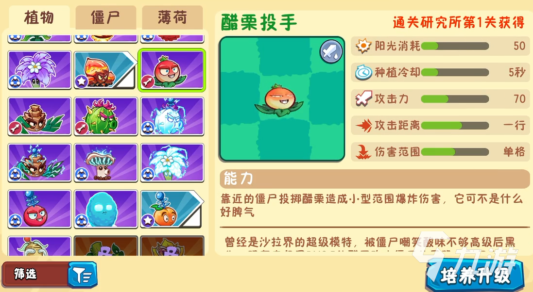 醋栗投手的能力是投出醋栗,对靠近的敌人造成小型的范围爆炸伤害,攻击力有70阳光消耗只要50的它非常适合当做主力攻击手。
