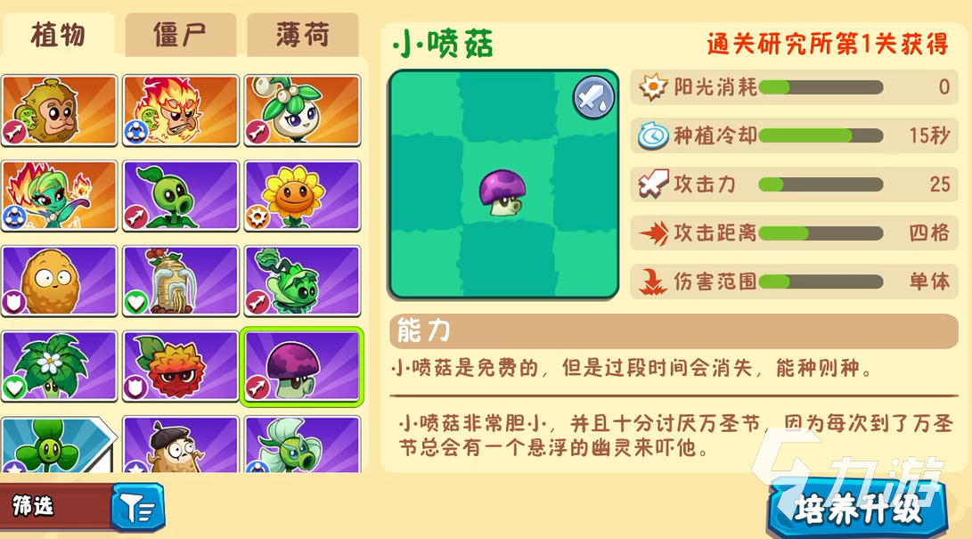 小喷菇虽然伤害不高,但是它是免费种植的,不需要消耗手上的阳光,所以在资源不充足的关卡必备。