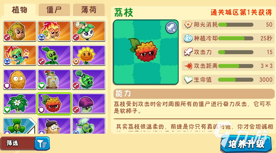 荔枝的能力是在自身受到伤害的时候,对周围所有敌人进行反击,适合种植在前排区域。