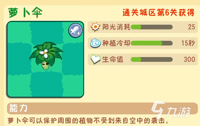 萝卜伞,这个植物也是当下很多人都有提到的一个,该植物也是属于辅助类型的植物。它自身基本上没有攻击力。消耗的阳光是25点,算是很便宜的一个植物,种植的冷却则是需要15秒,生命值是300点,这算是一个正常的生命值。萝卜伞的能力是它可以保护周围的植物不受到空中的袭击。在本作里敌人出现了空中攻击的敌人,基本上绝大部分的植物是无法对空进行攻击,同时也无法抵御,所以萝卜伞可以帮助咱们免受空中的攻击,在有空中攻击的关卡之中萝卜伞可以帮上大忙。