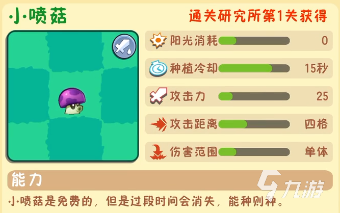 小喷菇,这个是很多玩家都十分喜爱的一个植物,这个植物在一些重要的场合会有着救场的效果。从目前来看,小喷菇本身种植是不需要阳光的,但是它在使用一段时间后会自动消失。它的种植冷却是15秒。攻击力是25,总体来说中规中矩。