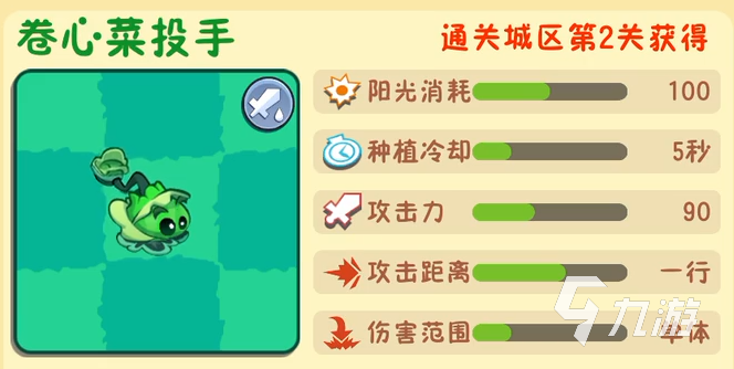下一个是卷心菜投手,这个也算是咱们的老朋友了,在本作中它的形象变得更加可爱了。这个植物需要阳光100点,种植冷却是5秒。攻击力不算高,但是可以攻击到一行的敌人。在进化之后还可以对敌人造成火焰伤害。是前期远距离植物之中非常好用的一个。