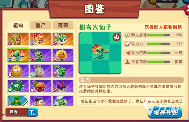 除了冰仙子之外,还有火仙子,自然是火元素的植物,伤害范围比较大,作为金卡,攻击力也达到了超高的215。它的大招是能朝着僵尸的方向投掷火球,初始造成大量损伤,后需还会让僵尸受到持续伤害。