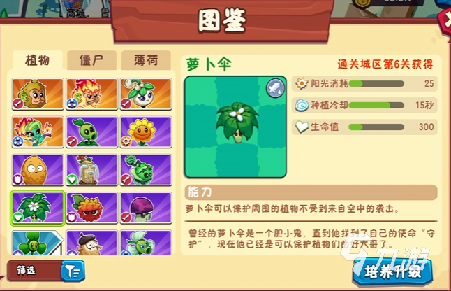 萝卜伞作为奇兵植物,在阳光的使用方面消耗低,虽然它并不具备攻击力,通常情况下并不会进行攻击,但是它的能力也是非常特殊的,毕竟新版本中有不少能通过空中行进的僵尸,这会给大家增加难度,带来较大的阻碍,而它就能阻挡空中的进攻,还能将空中下落的僵尸直接弹飞,拥有超强的对空能力。“容光焕发”就是它的大招,能让自己的血量和弹射此时直接回复到上限,生存能力非常强,同时对空效果还能持续恢复,有效对空中攻击进行阻碍。