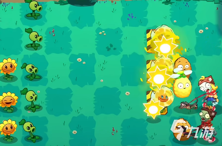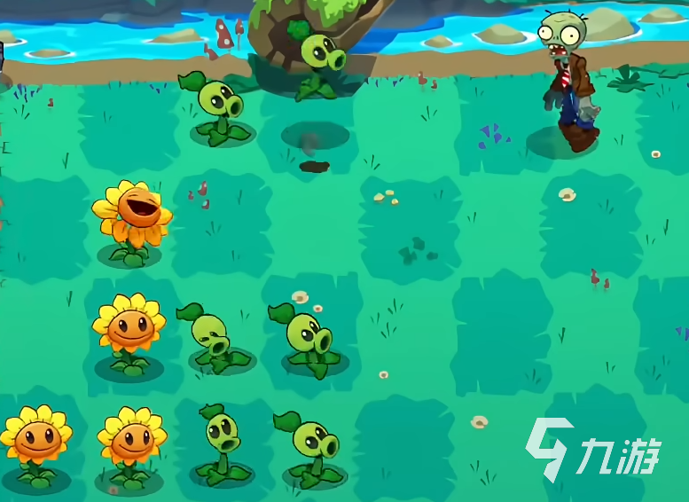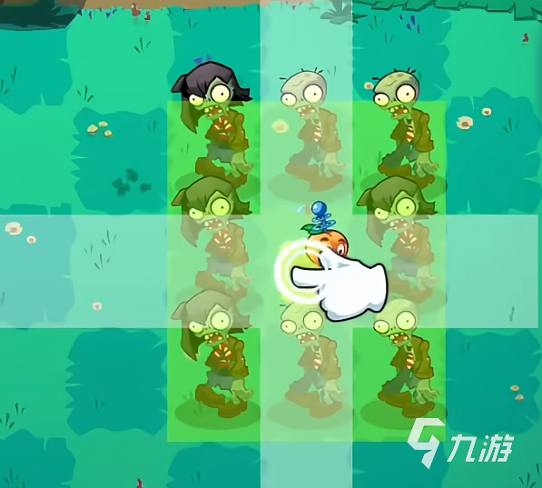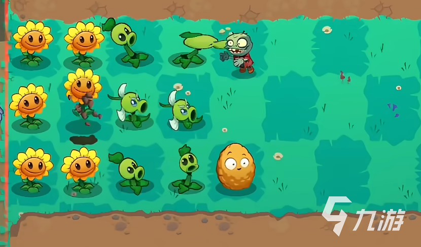 一开始我们需要在后面一排种植向日葵来收集阳光,之后除了最后一排以外都需要种上豌豆射手,其中尤其是第二行的敌人出现的是格外多,所以建议在前方的位置放置坚果,然后在第二行中间的位置来放置一个吹风草,这样咱们承受的压力会小上不少。等到压力缓解了再去最后一行种植一下豌豆射手。这一关敌人一多便要使用黄桃来将敌人眩晕来缓解压力。
