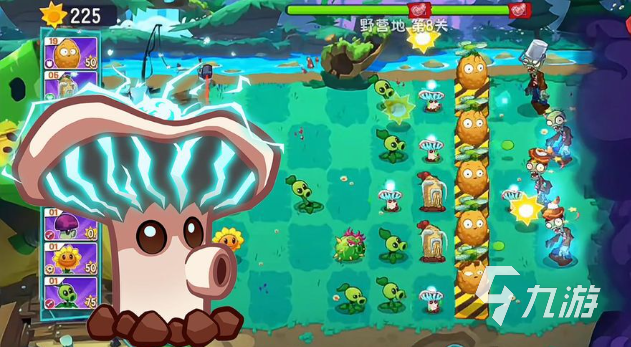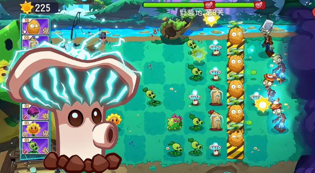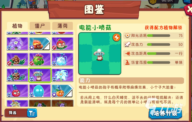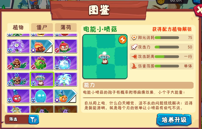 这是电系的远程植物,它喷出的孢子有一定几率附加麻痹效果,对右边4格范围内最近的1个僵尸发射电流孢子,可麻痹僵尸,延缓敌人的行动。小技能“电能分离”,不会在持续减少生命值,由电系坚果,或电流醋栗带去的电流累积1层,可获得50%攻速加成,击中僵尸后,对垂直方向分裂孢子,达到2层电流攻击,攻速提高到100%,还能想不通的方向发射分裂孢子。