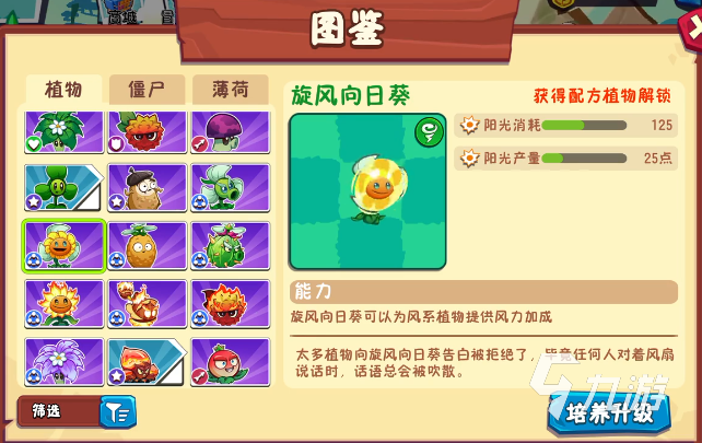 虽然它是风系产出阳光的卡片,不拥有攻击力,不过在辅助这块是非常强,主要能给风系植物提供“能量引擎”,可大幅度提高风系植物的作战效能,不带攻击力,但是每20秒可产出25点阳光。小技能“起风”,对当前一行右侧4格之内的缝隙植物,都带来1层风力的加成效果,且每0.5秒能对前面的僵尸造成微弱伤害,可较大限度提高一些输出植物的攻击力,快速瓦解僵尸。这个植物通过向日葵和三叶草就能进化而来。