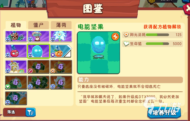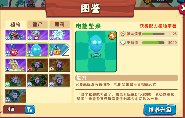 也是电系的植物,不过主要能力在防御方面,拥有超强的防御力。它是防御阵线自带“带电堡垒”,蓄能电网可对近距离范围内僵尸造成持续电能伤害,坚固生存在前排,能给后排输出植物创造更多输出时间,并不会主动攻击,但是拥有高额的生命值,被僵尸啃咬才会释放电流,除了少量电系伤害之外,还会让敌方获得20%减速,延缓僵尸的进攻节奏。小技能“电力护盾”,在激活之后,会在自己周围打造持续5秒的电网,进入电网的僵尸每秒都遭受中等电能伤害,并且提高它自己30%的防御力。