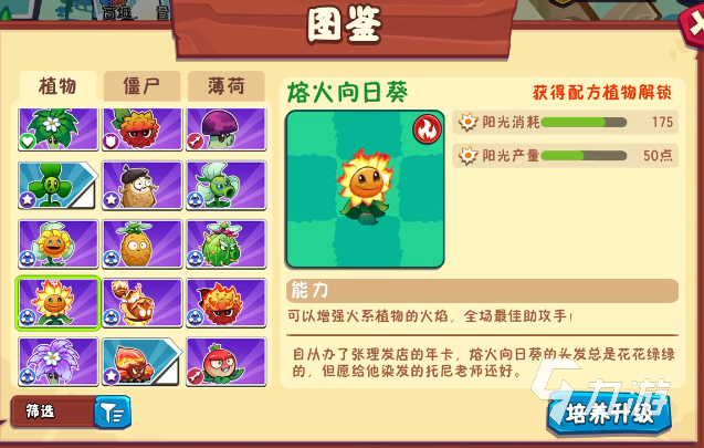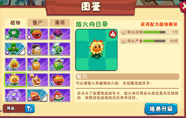 它也是辅助植物,只要是对火系的植物产生对应的增益效果,且它产出的阳光拥有特殊的火能,可增强火系植物的攻击力,提高它们的输出威力,还可释放火焰对僵尸达到威慑的作用,产出的阳光比旋风要多一些,火系的植物拾取了这种阳光,能提高10%的伤害。小技能“星火燎原”,对当前这行3格内施放出一道火焰波,伸出其中的僵尸受到火焰损伤,并给这一行所有火系植物添加1层“燃烧”加成,每层可提高5%攻速。